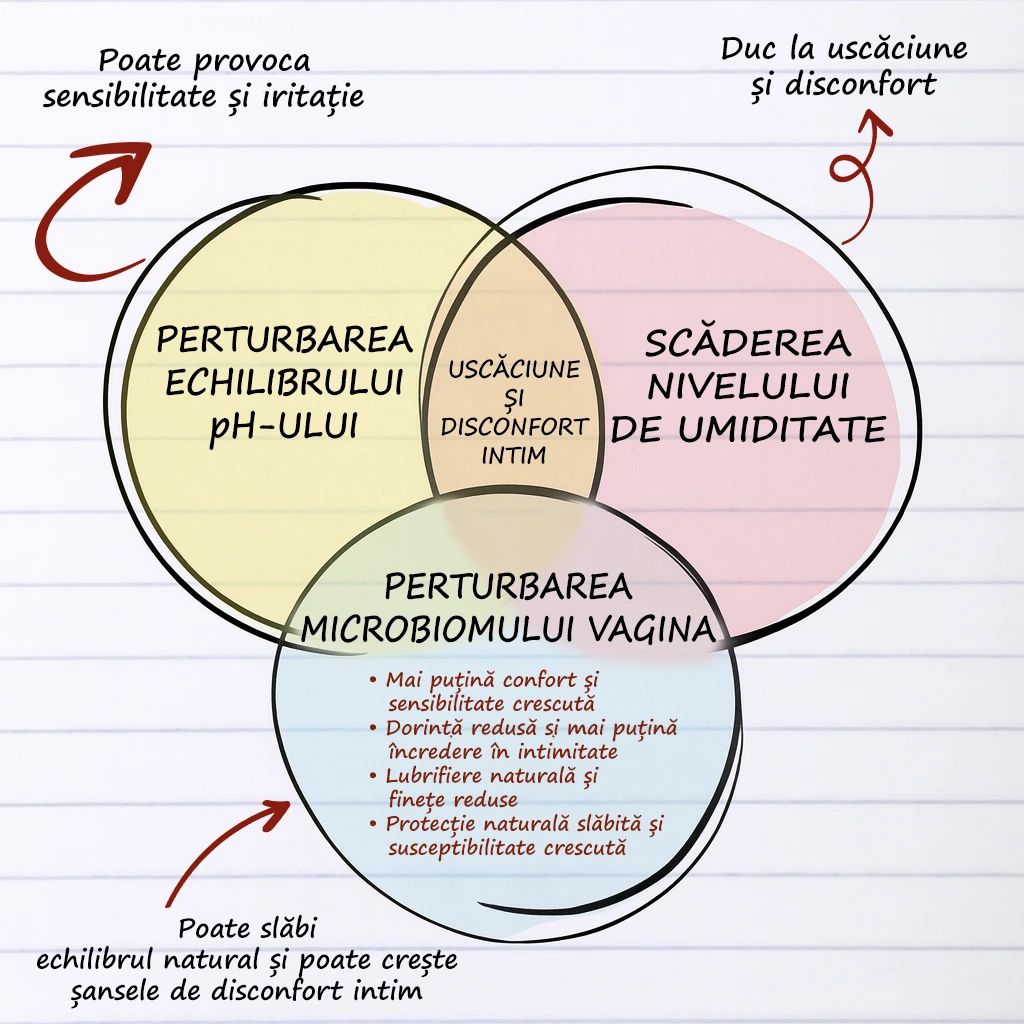 Iată cum scăderea hidratării este legată de ceilalți factori esențiali care influențează confortul intim.