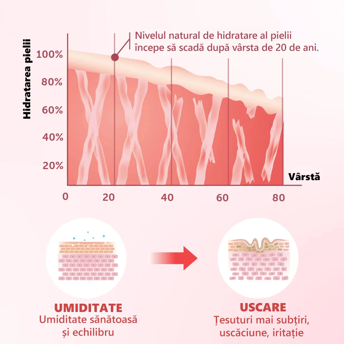 Graficul de mai jos ilustrează unul dintre procesele cheie care apar odată cu înaintarea în vârstă - scăderea naturală a hidratării țesuturilor.